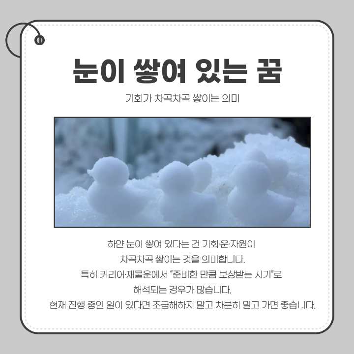 하얀 눈이 쌓여 있다는 건 기회·운·자원이 차곡차곡 쌓이는 것을 의미합니다.