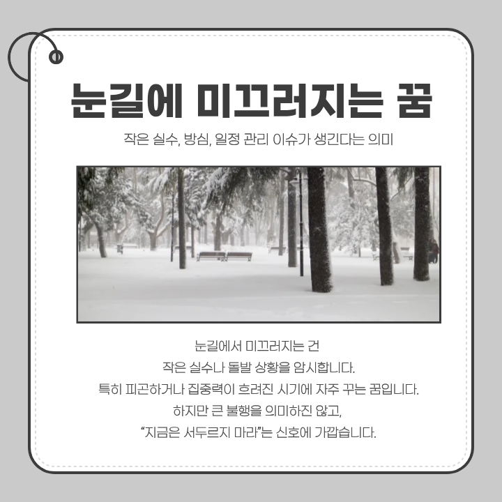 눈길에서 미끄러지는 건 작은 실수나 돌발 상황을 암시합니다.