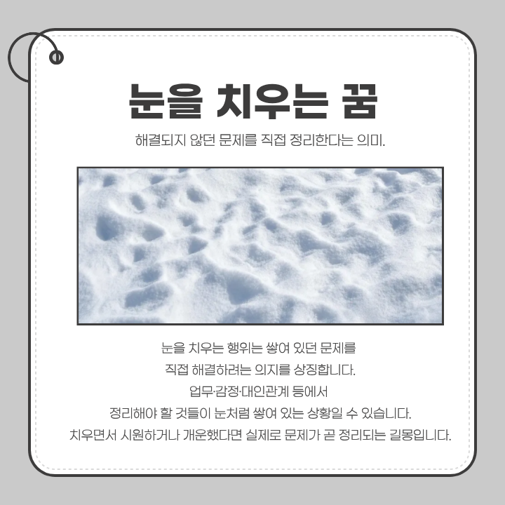 업무·감정·대인관계 등에서 정리해야 할 것들이 눈처럼 쌓여 있는 상황일 수 있습니다.