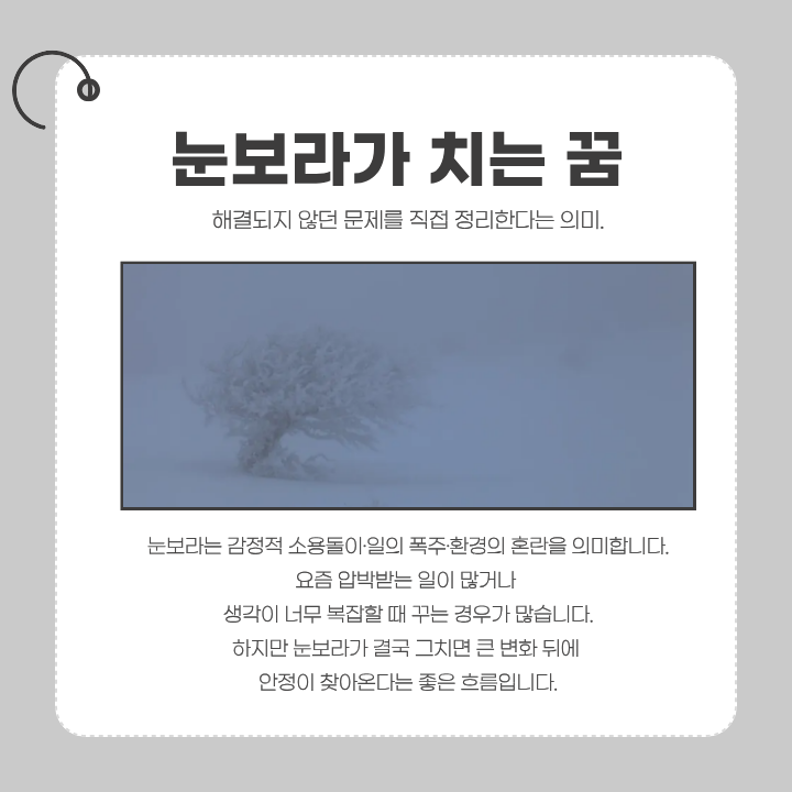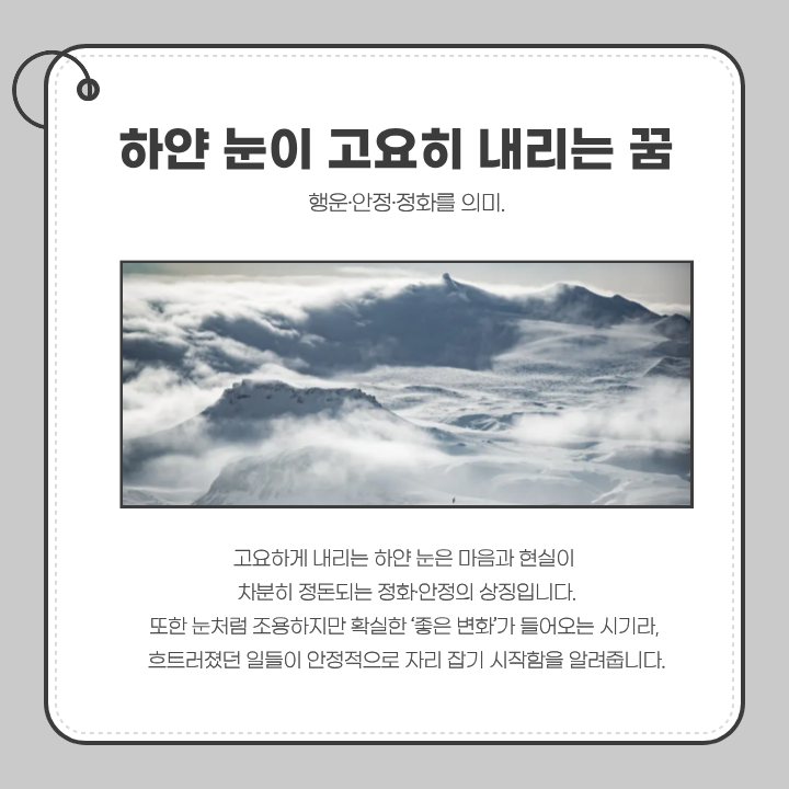 고요하게 내리는 하얀 눈은 마음과 현실이 차분히 정돈되는 정화·안정의 상징입니다.
