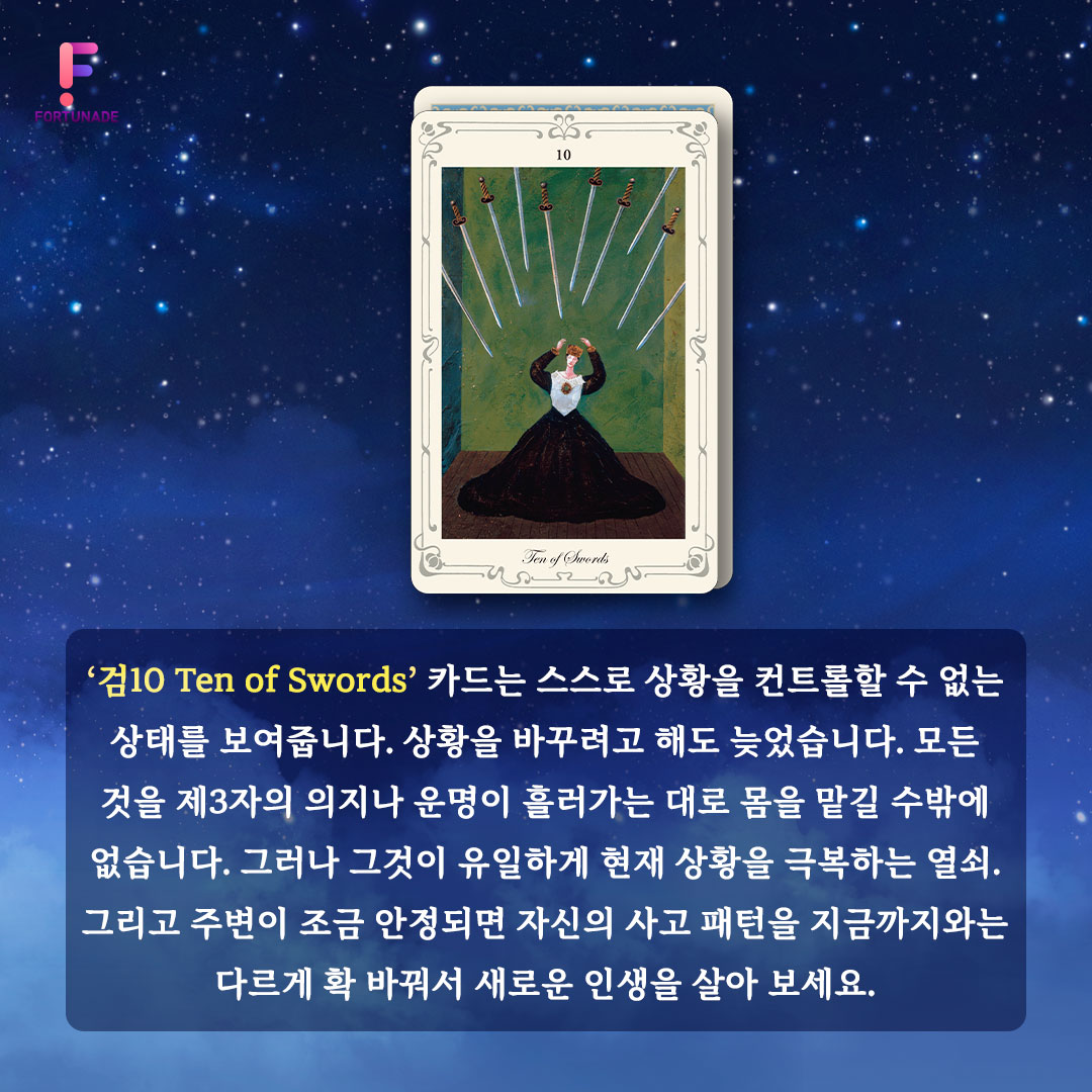검10 Ten of Swords' 카드는 스스로 상황을 컨트롤할 수 없는 상태를 보여줍니다.