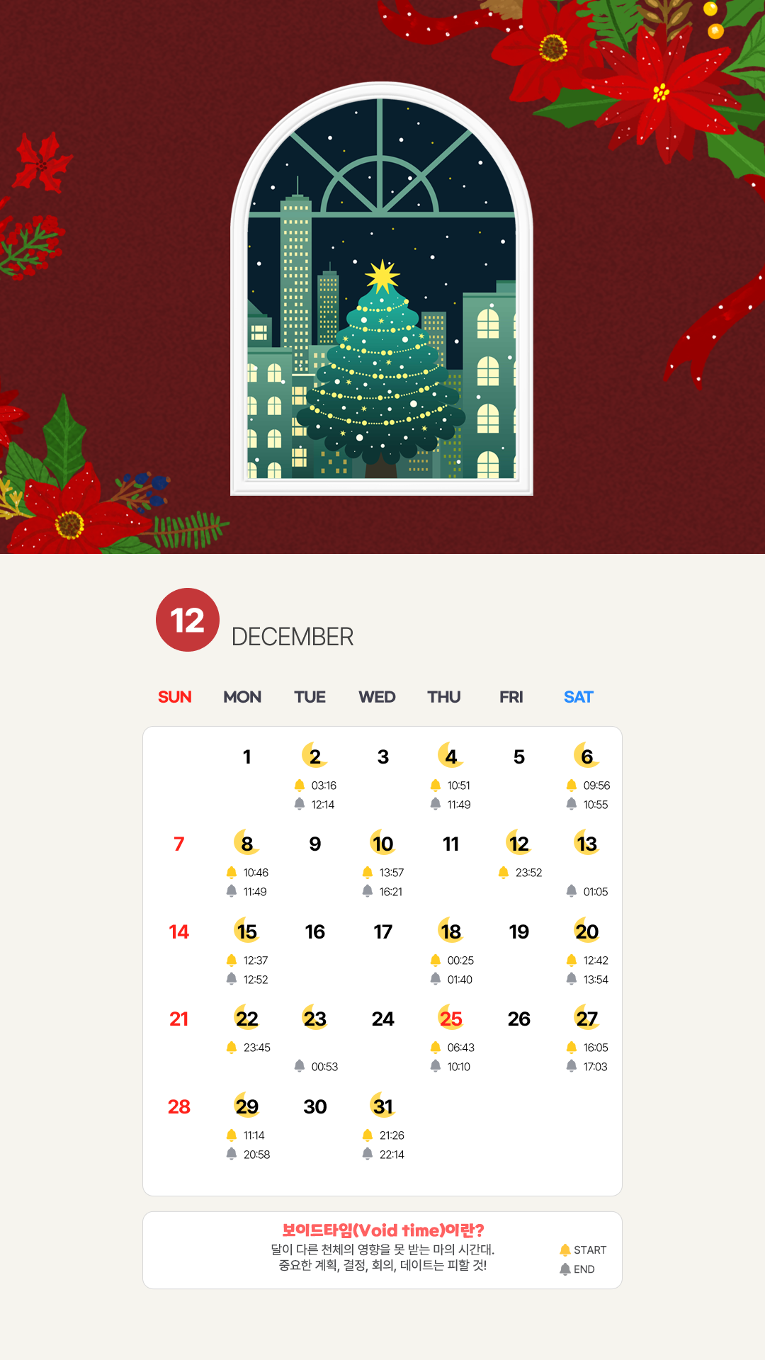 보이드타임이란 점성술에서 달의 영향력이 0인 상태로 달의 보호를 받지 못하는 시간. 사람들이 중대한 실수를 저지르기 쉬운 “마의 시간”이라고도 합니다. 보이드타임에 대한 자세한 내용은 예전 칼럼을 참고해 주세요.