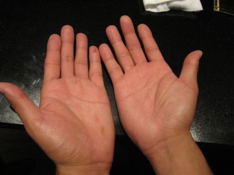 사진의 손은 “짧은 손가락”입니다. 참고로 이 손의 주인은 현역 프로 야구 투수의 손입니다. 저는 투수가 손가락 사이에 볼을 끼우고 던지기 때문에 손가락 길이가 길 거라고 생각했는데 전혀 아니었어요. 잘 생각해 보면 투수는 스포츠 선수이니 체력 승부에 특화된 “짧은 손가락”인 게 당연하겠죠. 손에는 물집 투성이. 아플 것 같아요~
