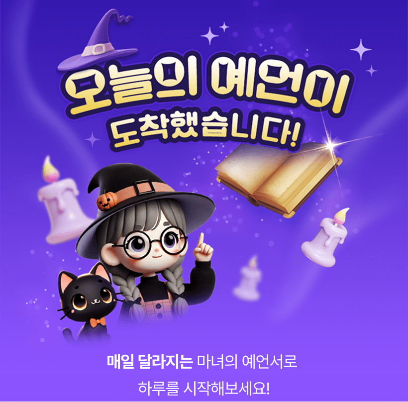 이벤트 이벤트 Hot Poll 무료 감정 출석체크 오늘의 예언이 도착했습니다! 매일 달라지는 마녀의 예언서로 하루를 시작해보세요! 닫기 매일 달라지는 예언! 내일은 또 다른 예언이 기다립니다. 내일도 만나요~!