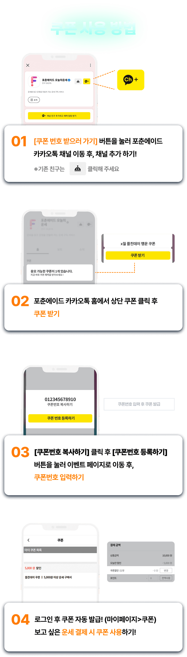 쿠폰 사용 방법 1 쿠폰받으러가기 버튼을 눌러 포춘에이드 카톡 채널 이동 후 채널 추가 하기. 2 포춘에이드 카카오톡 홈에서 상단 쿠폰 클릭 후 쿠폰 받기 3 쿠폰번호 복사하기 클릭 후 쿠폰번호 등록하기 버튼을 눌러 이벤트 페이지로 이동 후 (로그인 필요) 쿠폰번호 입력창에 입력하기 4 로그인 후 쿠폰 자동 발급 (마이페이지 쿠폰)